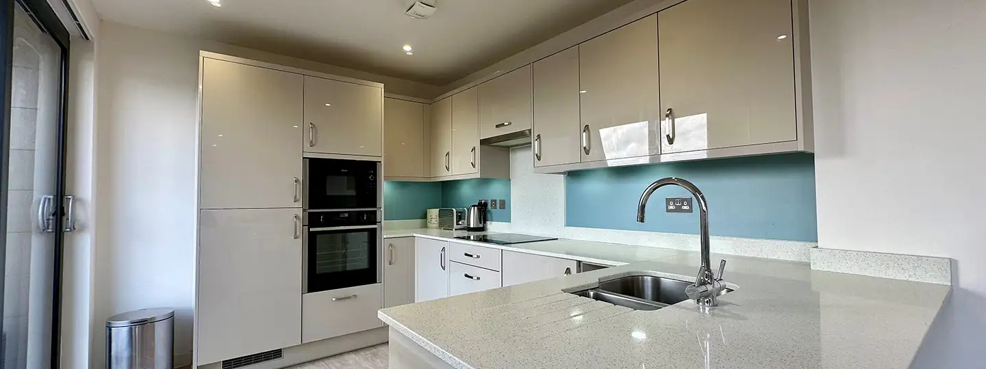 This retirement apartment in Salisbury features a premium finished kitchen with the latest integrated, low maintenance, energy-efficient appliances from Neff and soft close cupboards and drawers.